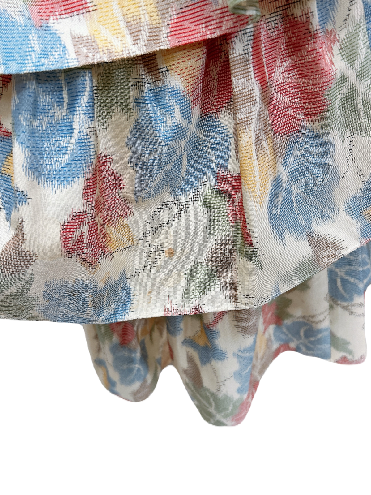 このスカートは、上品なクリーム色をベースに、淡い赤、青、緑の花模様が全体に描かれています。花々は抽象的でありながらも、どこか懐かしさを感じさせるデザインで、自然の美しさを軽やかに表現しています。色彩のバランスが絶妙で、華やかさと落ち着きを兼ね備えており、どの角度から見ても美しい印象を与えます。フリルが加わることで、動きに合わせて柄が優雅に揺れ、上品さと可愛らしさを引き立てています。
